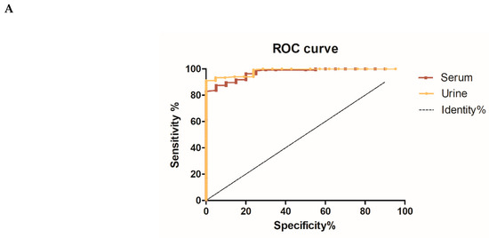 ELISA experiments were conducted according to Ludolf et al., with few modifications [21]. Briefly, previous titration curves were performed to determine the most appropriate concentration of antigens, antibodies/sample dilution and time of incubations to be used in the assays. High-binding ELISA plates (Nunc MaxiSorp™ flat-bottom; Invitrogen by Thermo Fisher Scientific, Carlsbad, CA, USA) were coated with 400 ng/well of N4S11-SC2 diluted in carbonate buffer pH 9.6 for 18 h at 4 °C. Wells were then blocked with a solution of PBS-T and 1% (w/v) BSA for 2 h at 37 °C. Then, 100 µL/well of urine (undiluted) or serum (diluted 1:100 in PBS-T) samples were added and the incubation occurred for 1 h or 30 min for urine or serum samples, respectively, at 37 °C, after which they were again washed. Peroxidase-conjugated anti-human IgG antibody (A18811, 1/10,000 dilution in PBS-T; Invitrogen, Carlsbad, CA, USA) was added to the wells and plates were incubated for 1 h or 30 min at 37 °C, for urine or serum samples, respectively. Next, wells were washed and reactions were developed by addition of TMB (3,3’,5,5-tetramethylbenzidine) for 15 min in the dark. Reactions were stopped by adding 0.5 M H2SO4 and the optical density (OD) values were read on a microplate spectrophotometer (Multiskan Go, ThermoFisher, Finland), at 450 nm. The cut-off values were determined as the mean plus 2.5 and 2.3 times the standard deviation of negative samples for urine and serum assay, respectively. The index (I) value for each sample was calculated using the equation I = (OD λ450 nm)/(cut-off). The index value was classified as positive above 1.1, indeterminate between 0.8 and 1.1 and negative below 0.8.