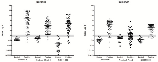 Comparative diagnostic performance among the recombinant N, S and N4S11-SC2 proteins. ELISA assays with the N, S and N4S11-SC2 were conducted using the same urine and serum samples from COVID-19 patients with previously positive qRT-PCR above 8 days PSO (n = 72) and from healthy control subjects (n = 18). The mean of each group is shown and the gray band indicates indeterminate values for each sample, while index values below the range (<0.8) are negative and values above (>1.1) are considered positive.