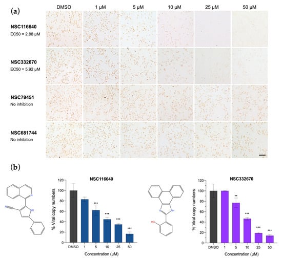Antiviral activities of NSC116640, NSC332670, NSC79451, and NSC681744 in a dose-dependent manner. (a) FMDV antigen detection using IPMA to elucidate the ability of NSC116640 and NSC332670 to inhibit FMDV replication in the post-viral entry stage. (b) Quantification of viral copy number from FMDV-infected BHK-21 cells after treatment with NSC116640 and NSC332670 at the indicated concentrations using RT-qPCR. The 0.1% DMSO was used as negative control. The data are presented as mean and SD. *** p < 0.001; ** p < 0.01.