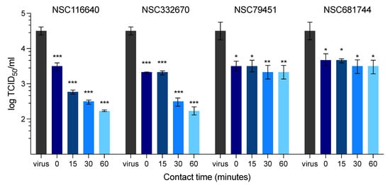 Evaluation of the virucidal effect of compounds at different time points (0, 15, 30, and 60 min) on FMDV replication over 72 h present as log TCID50. The data are presented as means and SD. *** p < 0.001; ** p < 0.01; * p < 0.05.