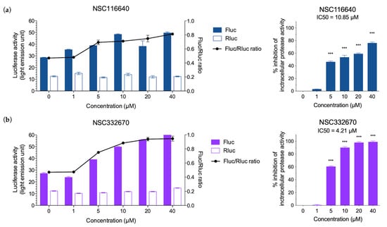 Intracellular protease assay of (a) NSC116640 and (b) NSC332670. Fold increases in FLuc/Rluc ratios in the HEK-293T cells transiently expressed with FMDV 3Cpro compared to that of 0.01% DMSO as a negative drug control. Filled color and empty bars are luciferase activities from firefly (Fluc) and Renilla (Rluc) luciferase, respectively. Inhibitory effects of the compounds on intracellular FMDV 3Cpro activity appear in a dose-dependent manner. The data are presented as means and SD. *** p < 0.001.