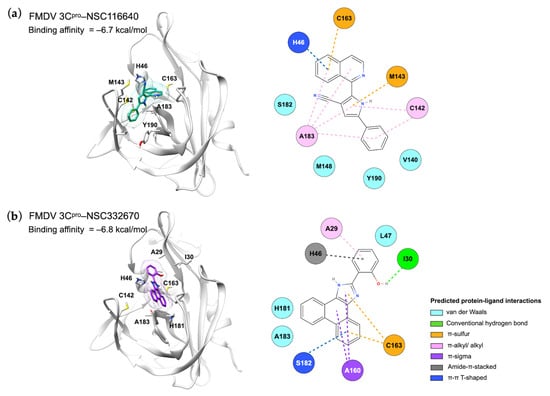Molecular interactions between FMDV 3Cpro and ligands (a) NSC116640 and (b) NSC332670 displayed in the 3D (left) and 2D (right) images.