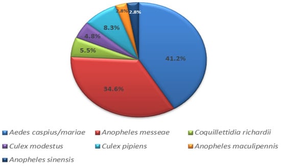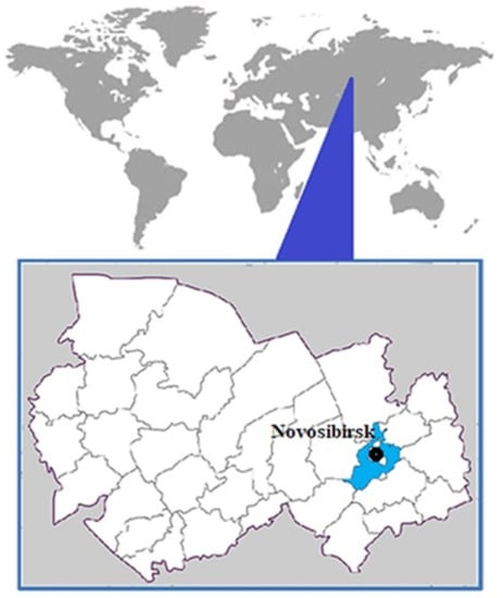 The south of the Western Siberian Plain is characterized by a continental climate, with short, warm summers and long winters; uniform humidity; and rather abrupt changes in all weather components over relatively short periods of time []. This region has experienced characteristic negative mean annual temperatures during the last century, with the maximum variation in the mean annual temperature being 3.6 °C over the observation period. The activity season for different species of mosquitoes begins when the ambient temperature rises above 0 °C (early May) and ends in late August or early September, depending on the year. The maximum duration of the period of mosquito activity is approximately four or five months. Seventeen species of mosquitoes were previously found in the forest–steppe and steppe zones of the region []. The composition of mosquito species from different foci can drastically vary. For example, the concentrations of Cq. richardii can vary from 1.7 to 99.5%, with this species usually dominating in the main forest–steppe and steppe landscapes of the rural part of the Novosibirsk region.
