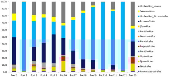The proportions for classified and unclassified viral reads are presented for 13 mosquito pools of Cq. richardii (Figure 3). The prevalence of unclassified and classified picornaviruses was detected in practically all the pools studied. Unclassified viral sequences were also analyzed, ranging from 0.13% to 34.27% for the different pools.