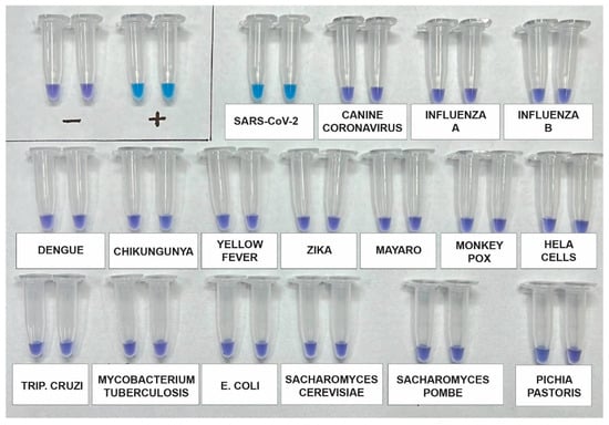 The analytical specificity of the assay was re-evaluated using a synthetic SARS-CoV-2 RNA standard, as well as RNA genomes from other viruses such as Influenza A (H1N1), Influenza B, Canine coronavirus, Dengue 1–4, Zika, Chikungunya, and Mayaro. Additionally, potential contaminants, including Saccharomyces cerevisiae, Saccharomyces pombe, Escherichia coli, and genomic human DNA, were included for testing using DNA from HeLa Cells. After incubating the samples for 60 min, the results indicated that the primers used in the kit specifically and accurately detected SARS-CoV-2 without any cross-reactivity (Figure 3).
