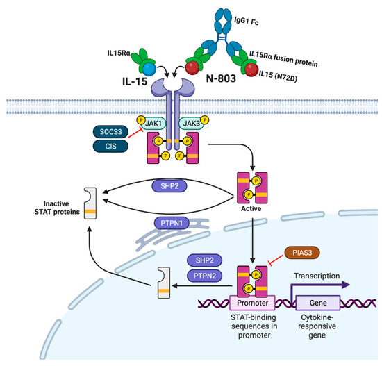 Signaling of IL-15 and N-803. IL-15 and N-803 signal through the same JAK/STAT pathway, resulting in activated STAT dimers binding to promoters and inducing gene transcription. Adapted from “Cytokine Signaling through the JAK/STAT pathway” (2023). Created with BioRender.com.