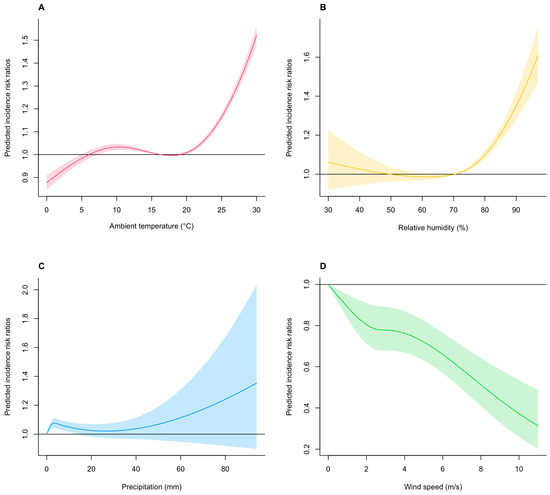 To test the sensitivity of the results to the modeling choices described above, we repeated the analysis by varying the df of the natural cubic spline of time from 7 df per year to 3 df or 11 df per year. We also performed a sensitivity analysis of the observed effect on the weeks of lags accounted for in the statistical model by modifying the length of the lag period from 2–3 and 4 weeks. We quantified the estimates as cumulative-week (i.e., 0–2 weeks) and single-week (i.e., 0, 1, and 2 weeks) IRRs together with the 95% confidence intervals (CIs) at the 25th and 75th percentiles of all meteorological drivers to determine the strengths of the associations. The reference value for ambient temperature and relative humidity were set as the median (50th percentile), while the precipitation and wind speed were set as 0.0 mm and 0.0 m/s, respectively. Additionally, we plotted the exposure–response curves to describe the overall cumulative associations. Statistical significance was considered at a p-value of <0.05 (i.e., type I error), on a two-tailed test. All analyses were performed using STATA version 15.1 statistical software (Stata Corp, College Station, TX, USA) and R statistical programming software version 4.1.0 (R Foundation for Statistical Computing, Vienna, Austria) using the “dlnm” [64].