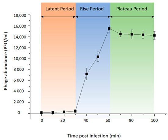 - Kropinski, A.M. Practical Advice on the One-Step Growth Curve. In Bacteriophages: Methods and Protocols; Clokie, M.R.J., Kropinski, A.M., Lavigne, R., Eds.; Methods in Molecular Biology; Springer: New York, NY, USA, 2018; Volume 3, pp. 41–47. ISBN 978-1-4939-7343-9. [Google Scholar]