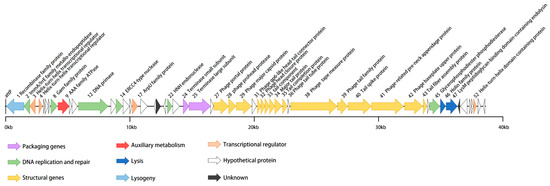 In the genomes of bacteriophages, ORFs encoding related biological functions tend to cluster, forming modules that can be co-regulated and co-inherited [41]. In the case of vB_BteM-A9Y, seven functional modules were identified in the genome, including modules involved in DNA packaging, structure morphogenesis, host lysis, DNA replication and repair, transcriptional regulation, lysogenic control, and auxiliary metabolism (Figure 3).