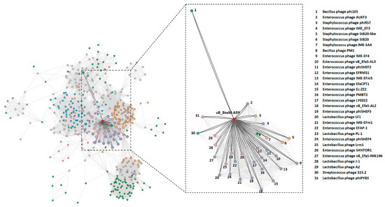 The BLASTn search of whole genome sequence of vB_BteM-A9Y against the GenBank revealed no existing homolog. Only two phage genomes show similarity to the vB_BteM-A9Y genome over low query coverage, i.e., Bacillus phage rho14 (GenBank accession number OM236514.1, 87.44% identity over 26% coverage) and Bacillus phage phi 105 (GenBank accession number NC_048631.1, 87.30% identity over 34% coverage). In addition, a total of 31 phages were predicted to be related with vB_BteM-A9Y (pairing-similarity score >1) by vConTACT2 analysis based on the protein-sharing network (Figure 4).