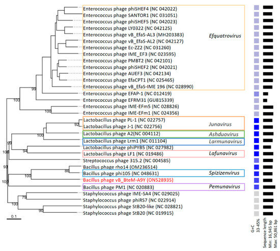 Phylogenomic tree of vB_BteM-A9Y and its related phages. This tree was generated using the Genome-BLAST distance phylogeny (GBDP) method, and the number near each node is the GBDP pseudo-bootstrap support value from 100 replications (only values > 50% are shown). Bacteriophage genus assignments according to the official ICTV classification (March 2023) are provided with different color frames. The GC content and sequence length of each phage genome is indicated on the right.