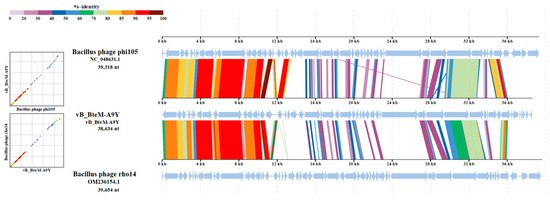 A linear comparison of multiple loci between vB_BteM-A9Y and its most related phages (Bacillus phage phi105 and Bacillus phage rho14) was conducted. The results showed that the right arm of three phage genomes shows low homology, while the left arm of these genomes shows relatively high homology (Figure 7). Further comparative analysis of genomic nucleotide similarity and ORF homology of vB_BteM-A9Y with Bacillus phage rho14, Bacillus phage phi105, and 29 other related phages showed that the intergenomic similarity between vB_BteM-A9Y and these phages was 0–33.2% (Figure 8). According to the recognized virus classification standards published by ICTV, viruses in the same genus should share >50% similarity in nucleotide sequence or > 40% ORF homologs [63,64]. Collectively, based on the comprehensive morphological, phylogenetic, and comparative genomic analysis, we propose that vB_BteM-A9Y belongs to a novel genus under Caudoviricetes.