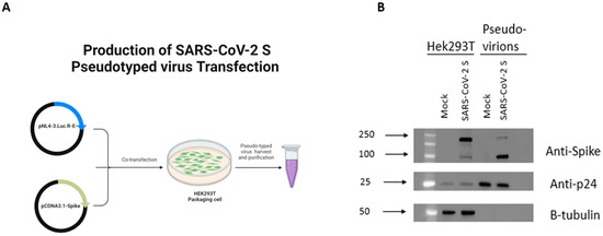Detection of SARS-CoV-2 S protein in Hek293T cell lysates and on pseudotyped virus. (A) Schematic representation of methodology utilized to produce Spike protein pseudotyped virus. (B) Western blot analysis of Spike protein in HEK293T lysates used for virus production and in virus particles. Anti-Spike was used to verify expression of Spike protein in cell lysates and pseudotyped virus. HIV anti-p24 and B-tubulin antibody were used as loading control for virions and cell lysates, respectively. Figure 1A generated using Biorender.