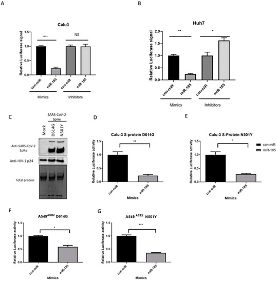 miR-185 inhibits pseudovirions entry in Huh7 hepatoma cell line and Calu-3 lung carcinoma cell line. (A) Huh7 cells were forward-transfected with miR-185 mimics/inhibitors or con-miR mimics/inhibitors and (B) Calu-3 cells were reverse-transfected with miR-185 mimics/inhibitors or con-miR mimics/inhibitors. After 24 h post-transfection, the cells were infected with SARS-CoV-2 S-pseudotyped virus. (C) Western blot analysis of Spike protein on pseudotyped virus particles. Anti-Spike was used to verify expression of Spike pseudo-typed virus and HIV anti-p24 for virions was used as loading control for virions. (D) Calu-3 cells infected with S-protein D614G pseudotyped virus (E) Calu-3 cells infected with S-protein N501Ypseudotyped virus (F) A549ACE2 cells infected with S-protein D614G pseudotyped virus (G) A549 ACE2 cells infected with S-protein N501Y pseudotyped virus. After 48 h post-infection, cells were lysed in 1X passive lysis buffer and Luciferase activity was measured using a microplate reader. Error bars represent the means ± SEM of at least three biological replicates. * p < 0.05, ** p < 0.01, *** p < 0.001, **** p < 0.0001, NS not significant.