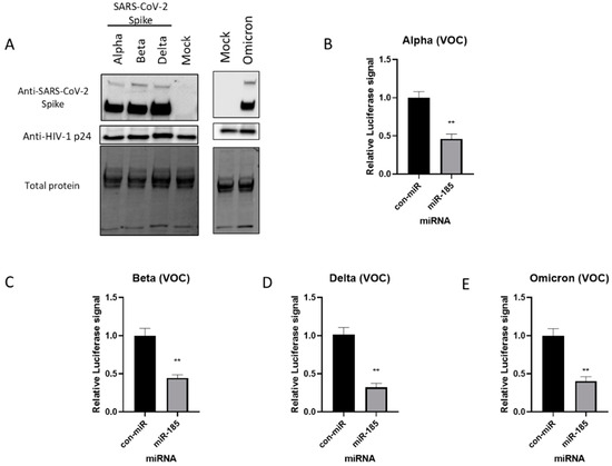 miR-185 inhibits entry of SARS-CoV-2 Alpha-, Beta-, and Delta-Spike-variant-pseudotyped virus in cell culture. (A) Western blot analysis of Spike protein on pseudotyped virus particles. Anti-Spike was used to verify expression of Spike pseudotyped virus and HIV anti-p24 for virions was used as loading control for virions. Calu-3 cells were transfected with miR-185 mimics or con-miR mimics and 24 h post-transfection, the cells were infected with media containing SARS-CoV-2 S-pseudotyped virus (B) Alpha (C) Beta and (D) Delta variants of concern (E) Omicron variant of concern. After 48 h post-infection, cells were lysed in 1X passive lysis buffer and Luciferase activity was measured using a microplate reader. All experiments were read in technical triplicates for at least three biological replicates. Error bars represent the means ± SEM of at least three biological replicates. ** p < 0.01.
