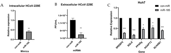 miR-185 inhibits HCoV-229E replication and infectivity. Huh7 cells were transfected with miR-185 mimics or con-miR mimics. After 24 h post-transfection, cells were infected with HCoV-229E at an MOI of 0.05. Cells lysed for RNA analysis of intracellular levels of virus 48 h post-infection. (A) Plaque assay of extracellular levels of virus. (B) Relative levels of extracellular virus from con-miR and miR-185-transfected cells. (C) qRT-PCR analysis of lipogenic genes in con-miR and miR-185-transfected cells. Error bars represent the means ± SEM of at least three biological replicates. * p < 0.05, ** p < 0.01, *** p < 0.001.
