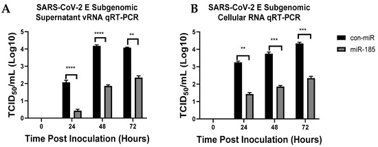 miR-185 results in significant inhibition in SARS-CoV-2 intracellular and extracellular levels at various time points post-inoculation. (A) Quantification of extracellular SARS-CoV-2 subgenomic levels from Calu-3 transfected with either con-miR or miR-185 at 24 h, 48 h and 72 h post-inoculation. (B) Quantification of intracellular SARS-CoV-2 subgenomic levels from Calu-3 transfected with either con-miR or miR-185 at 24 h, 48 h and 72 h post-inoculation. Error bars represent the means ± SEM of at least three biological replicates. Two-way ANOVA was used to determine the statistical significance. ** p < 0.01, *** p < 0.001, **** p < 0.0001.