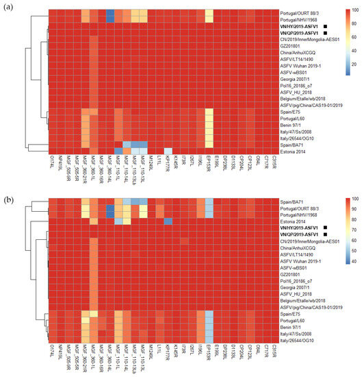 3.3. Genomic Comparison of VN/HY/2019-ASFV1 and VN/QP/2019-ASFV1 with Genotype I and II ASFV Strains