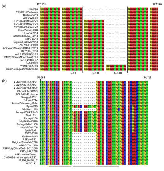 - Tran, H.T.T.; Truong, A.D.; Dang, A.K.; Ly, D.V.; Nguyen, C.T.; Chu, N.T.; Hoang, T.V.; Nguyen, H.T.; Dang, H.V. Circulation of two different variants of intergenic region (IGR) located between the I73R and I329L genes of African swine fever virus strains in Vietnam. Transbound. Emerg. Dis. 2021, 68, 2693–2695. [Google Scholar] [CrossRef]
