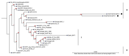 - Nguyen, V.T.; Cho, K.H.; Mai, N.T.A.; Park, J.Y.; Trinh, T.B.N.; Jang, M.K.; Nguyen, T.T.H.; Vu, X.D.; Nguyen, T.L.; Nguyen, V.D.; et al. Multiple variants of African swine fever virus circulating in Vietnam. Arch. Virol. 2022, 167, 1137–1140. [Google Scholar] [CrossRef]