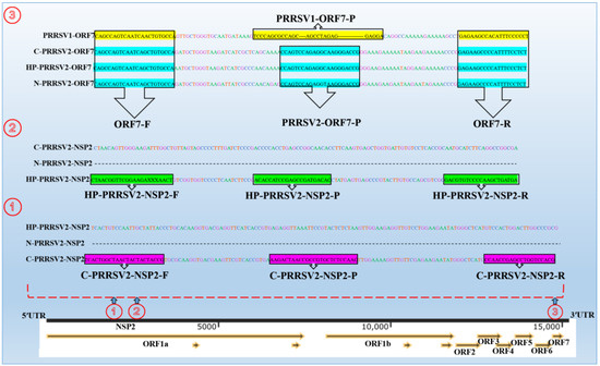 Primers and probes designation chart. Three gene fragments of PRRSV are named as ①, ②, and ③. Fragment 1 corresponds to the NSP2 region of classical strains, targeted by C-PRRSV2-NSP2-F/R/P primers and probes. Fragment 2 corresponds to another NSP2 region of highly pathogenic strains, targeted by HP-PRRSV2-F/R/P primers and probes. NADC30-like strains lack gene fragments in both NSP2 (① and ②) regions. Fragment 3, located in the ORF7 region, was targeted by PRRSV1-ORF7-P and PRRSV2-ORF7-P probes to distinguish between PRRSV1 and PRRSV2.