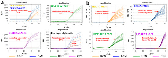 Optimization of annealing temperature and primer/probe concentrations in quadruple fluorescent RT–qPCR test. The optimal annealing temperature for the four virus plasmids was determined to be 59 °C. (a) Cross-validation of primers and probes for the four recombinant plasmids performed with varying concentrations. (b) Amplification results obtained from a concentration crossover experiment of primers and probes for the four recombinant plasmids. The optimal concentrations for the best amplification were 0.4 and 0.3 μmol/L of the primers and probes, respectively. The yellow, blue, green, and purple curves represent the amplification results of the PRRSV1-ORF7, PRRSV2-ORF7, HP-PRRSV2-NSP2, and C-PRRSV2-NSP2 plasmids, respectively. The red arrow indicates the curve of the optimal amplification.