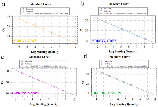 The quadruple RT-qPCR exhibited a standard curve slope ranging from −3.46 to −3.15. The correlation coefficient (R2) ranged from 0.99 to 1.00, and the amplification efficiency (E) ranged from 94.5% to 107.5%. Each dilution had 3 replicates (Figure 4a–d). A linear correlation between copy number and Ct value was observed. The corresponding linear equations for copy number (x), Ct value (y), and the correlation coefficient R2 were as follows: PRRSV1-ORF7: y = −3.461x + 44.794, R2 = 0.995, E = 94.5%. PRRSV2-ORF7: y = −3.242x + 38.208, R2 = 1.000, E = 103.4%. C-PRRSV2-NSP2: y = −3.155x + 40.311, R2 = 1.000, E = 107.5%. HP-PRRSV2-NSP2: y = −3.288x + 44.096, R2 = 0.999, E = 101.4%.