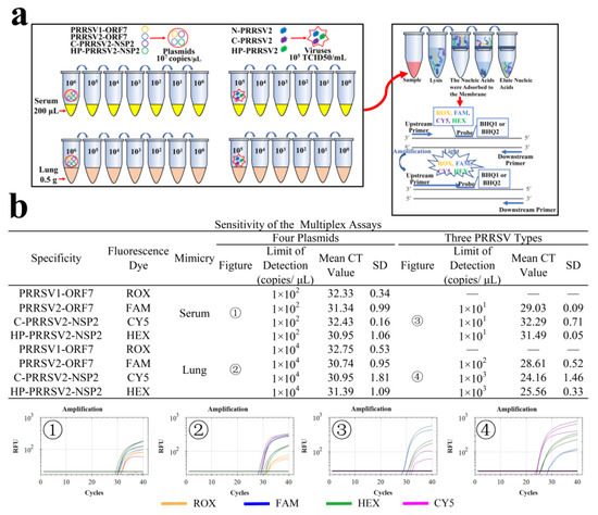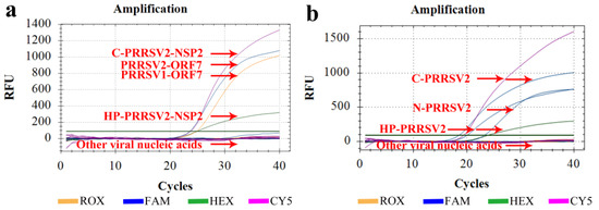 The LODs of serum samples and lung tissue samples simulated by plasmids were determined to be 1 × 102 copies/μL and 1 × 104 copies/μL. The LODs of serum samples and lung tissue samples simulated by viruses were determined as 1 × 102 copies/μL (ORF7), 1 × 103 copies/μL (C-PRRSV2-NSP2), and 1 × 104 copies/μL (HP-PRRSV2-NSP2) (Figure 8a,b).