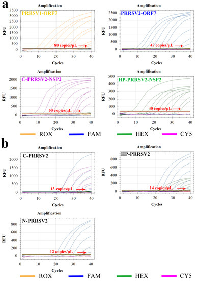 Minimal detection limits of the quadruple fluorescent quantitative PCR method. (a) Detection limits of PRRSV1-ORF7, PRRSV2-ORF7, HP-PRRSV2-NSP2, and C-PRRSV2-NSP2 plasmids: 80, 47, 50, and 40 copies/μL, respectively. (b) Minimum detection limits of the copy numbers for the three strains C-PRRSV2, HP-PRRSV2, and N-PRRSV2: 13, 14, and 12 copies/μL, respectively.