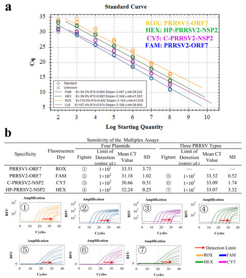 Standard curves and LODs. (a) Standard curves of the four plasmids. (b) Minimum limits of nucleic acid in detecting four plasmids (PRRSV1-ORF7, PRRSV2-ORF7, C-PRRSV2-NSP2, and HP-PRRSV2-NSP2) and three PRRSV (C-PRRSV2, HP-PRRSV2, and N-PRRSV2) subtypes.