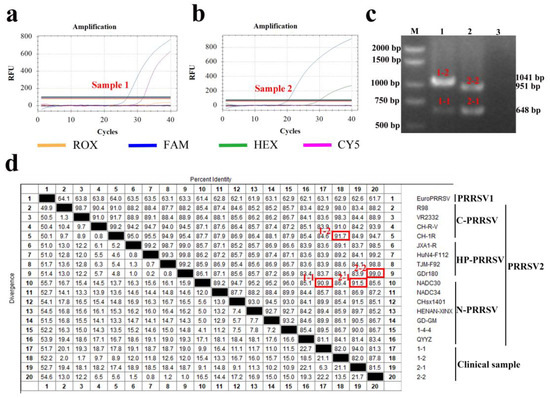 After PCR amplification of the NSP2 gene and gel electrophoresis, two bands were observed in sample 1 (1041 and 648 bp) and sample 2 (951 and 648 bp) (Figure 10c). The four bands were gel purified for NSP2 gene sequencing, and the sequence alignment showed that the homology of two sequences amplicons (bands) in sample 1 to N-PRRSV2 and C-PRRSV2 was 90.90% and 91.70%. Likewise, those of two sequences amplicons in sample 2 to C-PRRSV2 and HP-PRRSV2 were 91.50% and 99.00% (Figure 10d). These results indicated that the RT-qPCR method can also detect mixed infections.