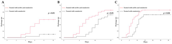Regarding the length of hospitalization, the estimated rates of hospital discharge at days 7, 14, and 28 were higher in the CTG than in the MTG, which is consistent with the study by Andrea et al. [44]. In their study, among 314 COVID-19 patients treated with sotrovimab (33.1% had immune depression, 7% were transplant recipients, and 27.3% had oncological disease), 96 patients (30.5%) were administered antiviral drugs in addition to sotrovimab. They found that patients treated for COVID-19 had a lower median hospital stay and higher discharge rate on days 7 and 14 compared with those not treated.