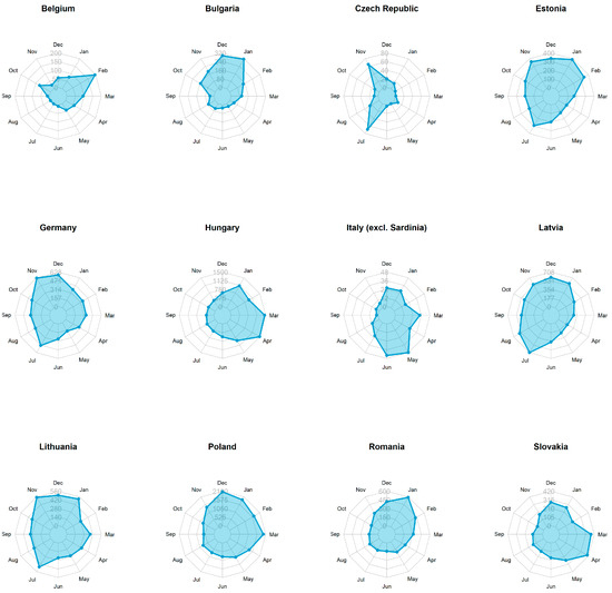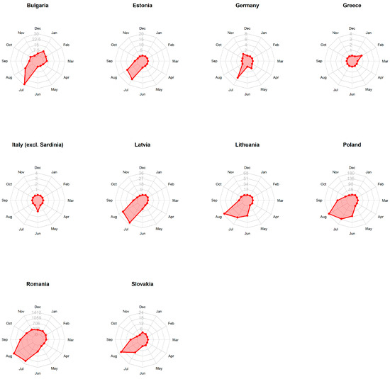 Radar charts of wild boar cases. Seasonal distribution of wild boar tested positively for ASF in different European Union countries across the months (except for cases in Sardinia), irrespective of the year of occurrence (the scales are adjusted to the maximum number of cases in each country).