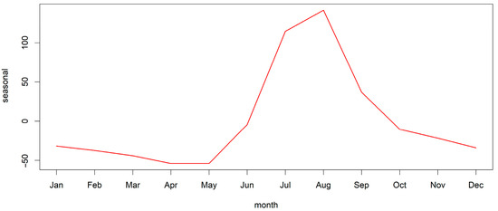 Seasonal pattern of wild boar cases in the European Union. The figure shows a summary of the seasonal pattern in the monthly course of the year of total ASF cases in wild boar in the European Union (except for cases in Sardinia) throughout the time period from the first occurrence in 2014 until 31 December 2022. Further components of the time series are shown in Appendix A, Figure A2.