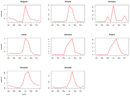 Decomposing the time series of all ASF outbreaks in all countries included in the analysis revealed a seasonal pattern with one yearly peak (Figure 2 and Appendix A, Figure A1). Figure 2 shows a summary of the seasonal pattern in the monthly course of the year for all analysed countries during the study period. Appendix A, Figure A1 shows the details of the components of the dissected time series. The seasonality in the time series was confirmed in the global Friedman test (p < 0.001) for all countries included in the analysis. The yearly peak according to the dissection of the time series occurred in summer, mainly in July and August, and it could be detected in Bulgaria, Estonia, Germany, Latvia, Lithuania, Poland, Romania and Slovakia (Figure 3). However, the Friedman rank test confirmed seasonality in Latvia (p = 0.032), Lithuania (p = 0.026), Poland (p = 0.004) and Romania (p = 0.003) only (Appendix A, Table A1).