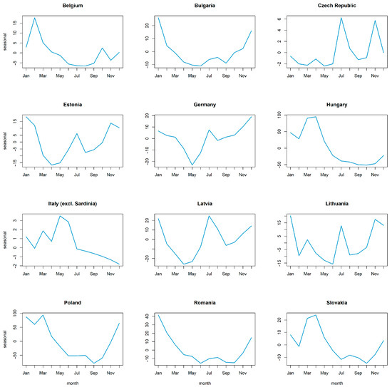 Large case numbers were observed in Bulgaria, Estonia, Germany, Latvia, Lithuania and Romania in the winter months, especially in December and January. Decomposing the data for each country individually (Figure 6) confirmed a seasonal peak in the winter months, mainly in January, for these countries. However, the Friedman rank test confirmed seasonality in Bulgaria (p = 0.012), Estonia (p < 0.001), Latvia (p < 0.001), Lithuania (p = 0.018) and Romania (p = 0.003) (Appendix A, Table A2).