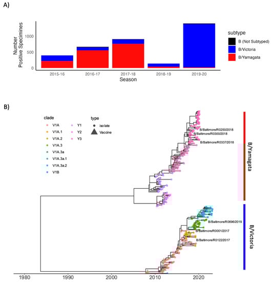 3.1. Maryland Influenza B Clinical Frequency and Hemagglutinin (HA) Phylogenetic Assessment