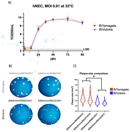 Characterization of viral fitness between B/Yamagata and B/Victoria viruses. (A) Viral fitness assessment on hNEC revealed no significant difference in infectious virus production out to 96 h post-infection of Baltimore clinical isolates. B/Yamagata curves consists of data from B/Baltimore/R0250/2018 and B/Baltimore/R0337/2018 clinical isolates. B/Victoria curves consist of data from B/Baltimore/R0001/2017 and B/Baltimore/R0122/2017. Growth curves completed in two independent experiments, each experiment consisted of three replicate wells. Statistical significance of growth curves calculated on GraphPad Prism using a two-way ANOVA and Tukey’s multiple comparisons. (B) Representative wells shown comparing plaque size from two independent experiments of the two lineages of IBV on MDCK cells. All plaques in experiment wells were counted for analysis. (C) Comparison of plaque sizes formed by two clinical isolates from each IBV lineage. Graphed plaque areas are the combination of two independent experiments. Images of plaques were analyzed with ImageJ. Statistical significance of plaque assays calculated on GraphPad Prism using a two-way ANOVA and Tukey’s multiple comparisons. * denotes statistical significance of p < 0.05.