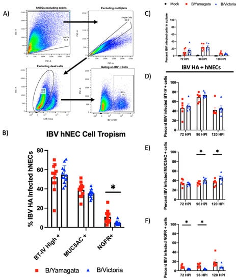 Bui et al. used immunohistochemistry (IHC) to show that IBV clinical isolates from both lineages infect multiple cell types in the bronchial respiratory epithelium. We sought to define cell tropism in our hNEC model. Using flow cytometry, we can gain a quantitative view of IBV infection over the initial five days of infection. IBV-infected hNECs were isolated by first gating out debris, multiplets and dead cells followed by gating of IBV HA-positive cells (Figure 4A). We used intracellular markers commonly used to describe various cell types in the respiratory epithelium. Beta-Tubulin-IV (BT-IV) was used to define mature ciliated cells [27,28]. The hNEC cultures showed three populations of BT-IV staining (Supplemental Figure S1A). Total populations include a negative staining population, an intermediate population and a BT-IV positive population. When fluorescence was plotted against the side scatter area (SSC-A), a distinct rise in the population with the highest fluorescence was seen consistent with developing cilia (Supplemental Figure S1A). MUC5AC was used as the intracellular target to identify mucus-producing cells [29]. This would encompass both goblet cells as well as ciliated cells that produce mucus as has been well defined in the literature (Supplemental Figure S1A) [30,31]. NGFR (CD271) was used as a marker for respiratory basal cells [28]. NGFR staining in our hNEC cultures did not show any significant co-staining with the brightest BT-IV population defined as ciliated cells or MUC5AC-containing cells consistent with expected protein production in these developing cell types (Supplemental Figure S1B,D). Once these cell types were identified, we used this method to identify quantitative IBV cell tropism of our infected hNEC cultures. At peak infectious virus production, 72 hpi, the majority of IBV-infected cells were ciliated cells (B/Victoria 54.77% and B/Yamagata 52.18%, p = 0.599) followed by mucus-producing cells (B/Victoria 35.45%, B/Yamagata 39.04, p = 0.155) and basal cells (B/Victoria 4.81, B/Yamagata 11.06, p = 0.0045) (Figure 4B). There was no significant variation between lineages in the ciliated cell or mucus-producing cell populations. B/Yamagata viruses infected significantly higher NGFR + basal cells compared to B/Victoria (Figure 4B).