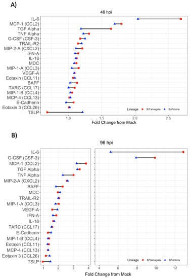To expand the understanding of innate immune responses in influenza B virus infection using protein level immunoassays, a custom Luminex panel was designed to detect commonly upregulated cytokines and chemokines in response to infection with influenza and other respiratory viruses [32]. Cytokine and chemokine production was evaluated both at 48 hpi and 96 hpi. Cytokine production is about 4-fold higher at 96 hpi compared with the 48 h time point (Figure 5A,B). Regardless of significantly greater production, relationships of cytokines and chemokines produced remained relatively similar between time points. CXCL-10, IL-6, G-CSF, MCP-1, TGF-a, TNF-a, MIP-2-A, BAFF, MDC, TRAIL-R2 and MIP-1-A all had at least 2-fold change from mock-infected wells, although many proteins in the panel showed some degree of upregulation post-infection (Figure 5A,B). CXCL-10 had the highest degree of upregulation between 30- and 50-fold mock at 96 hpi (data not on graph given scale difference). There was no significant difference between cytokine production in response to infection when comparing B/Yamagata and B/Victoria (Supplemental Table S1).