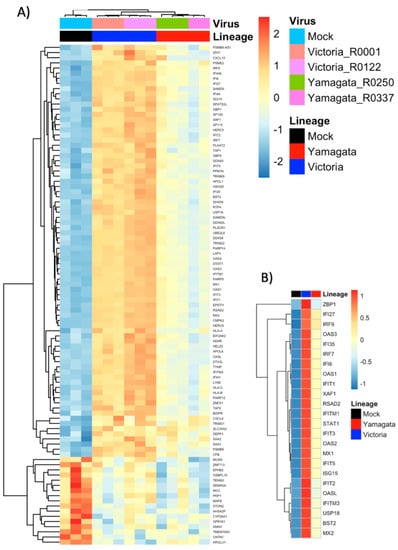 hNEC transcriptional response to B/Victoria and B/Yamagata infection. (A) Heatmap of DEGs with a padj ≤ 0.05 in hNECs (n = 122). (B) Subset the complete heatmap of annotated by the top 24 differentially expressed genes summarized by B/Yamagata and B/Victoria lineages.