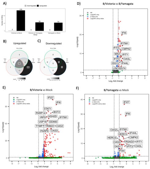 Differentially expressed genes between B/Victoria and B/Yamagata-infected hNECs. Total Differentially expressed genes (DEGs) at threshold cutoffs of a log2 fold change ≥ 0.8 and padj ≤ 0.05. (A) Total up and downregulated genes at threshold cutoffs representative of all DESeq2 design comparisons. Venn diagrams for each design comparison separated by up (B) and down (C) regulated genes. Volcano plots of DEGs at threshold for B/Victoria vs. B/Yamagata, (D) B/Victoria vs. mock (E) and Yamagata vs. mock (F).