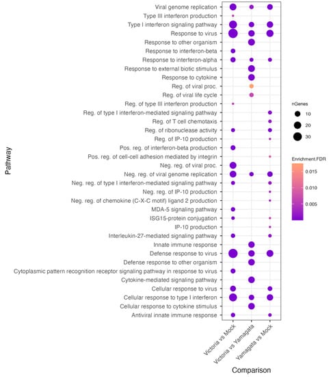 To further identify differentially expressed gene pathways of infected hNECs, we performed gene ontology analysis on identified DEGs. Only upregulated genes were considered. Analysis was performed on each DEG analysis for all DESeq2 comparison groups by lineage. First, gene set enrichment analysis (GSEA) was performed on DESeq2 output across all comparison groups: B/Victoria vs. mock, B/Yamagata vs. mock and B/Victoria vs. B/Yamagata. We focused on a broader range of genes filtering for a log2 fold change ≥ 0.8 and p-value ≤ 0.5 to evaluate pathways. No unique pathway differences were identified between lineage treatment groups belonging to the antiviral response systems, cytokine signaling type I, type III interferon pathways, and negative regulation of viral replication or processes (Figure 8). B/Victoria vs. mock groups consistently identified a higher number of genes in each shared pathway belonging to cellular response and to type I interferon, as well as the defense response to virus, type I interferon signaling pathway and negative regulation of viral processes driven by the unique subset of genes upregulated by B/Victoria infection.