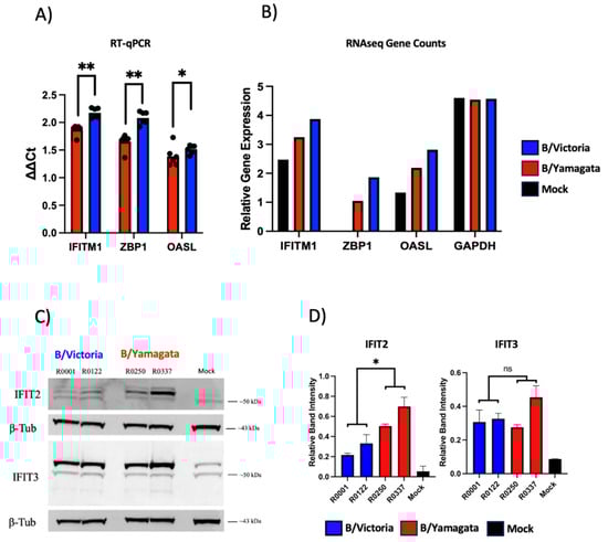 To validate mRNA differential expression from RNAseq, 48 hpi hNEC infections were repeated as described above. Cell lysates were subjected to RT-qPCR and Western blotting for identified upregulated genes in the interferon response gene and antiviral pathways. Total mRNA for ifitm1, zpb1 and oasl were induced after viral infection from both lineages representing results consistent with RNAseq data (Figure 9A,B). For protein production validation, ISGs IFIT2 and IFIT3 were selected and quantified with Western blotting. Induction of IFIT2 and IFIT3 were observed in hNECs across both lineage infection groups with the strongest signal observed in B/Yamagata-infected cells for IFIT2 with similar amounts of protein detected across all virus infections for IFIT3 (Figure 9C).
