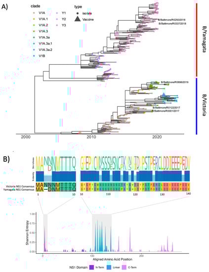 Influenza B NS1 protein has diverged by lineage and HA clade (A) influenza B phylogenetic tree of representative NS1 sequences (n = 283) isolated between 2009 and 2023. NS1 open reading frames were extracted using the NCBI influenza annotation tool (https://www.ncbi.nlm.nih.gov/genomes/FLU/annotation/ (accessed on 14 March 2023)) and aligned using Muscle (v3.8.31) with the PPP algorithm. Time-scaled maximum-likelihood trees were constructed using treetime v0.9.6 and annotated by lineage in R (v4.1.2) using ggtree v3.16. (B) Amino acid alignments were used to calculate Shannon entropy by site using the vegan v2.6-4 and seqinr 4.2-23 packages and visualized using R v4.1.1. IBV NS1 domains were annotated according to PDB: 5DIL and BMRB: 25462. Amino acid site richness and percent identity were visualized using ggmsa 3.16.