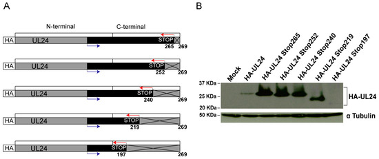 Deletion mutations targeting the C-terminal domain of HSV-1 UL24: (A) The schematic representation of the deletion series created for the C-terminal domain of UL24. The HA tag is represented with a white box, and the UL24 amino acid sequence is shown with the gray and black boxes to the right. The numbers below the boxes represent UL24 amino acids. The black box represents the amino acids corresponding to the fragment of UL24 that was amplified via PCR to construct the respective plasmid, with the position of the primers used for amplification shown in blue and red. Stop codons were introduced into the three ORFs to block translation after aa 265, 252, 240, 219or 197. The crossed lines in the gray box represent the deleted regions of UL24. (B) Western blot analysis showing the expression of the full-length and truncated HA-UL24 proteins 48 h post-transfection. Cell lysates of COS-7 cells transfected with a plasmid encoding wild-type HA-UL24 or encoding HA-UL24 with the indicated deletion were analyzed using Western blotting with an anti-HA antibody (top panel). The blot was subsequently stripped and incubated with an antibody against α Tubulin, which served as a loading control (bottom panel). The sizes of molecular weight markers are indicated to the left of the panels.
