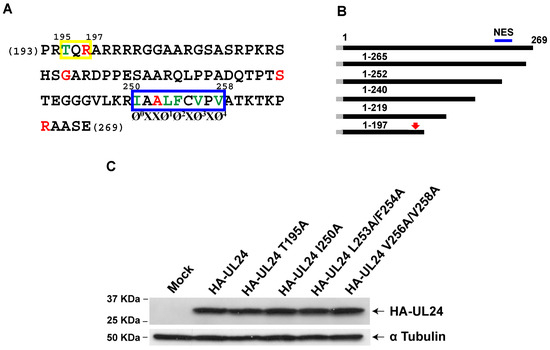 The analysis of the primary sequence of the UL24 C-terminus between aa 241 and 265 suggested a possible “non-classical” nuclear export signal (NES) between aa 250 and 258 that would contain five hydrophobic residues (Figure 3A,B). This sequence was similar to several “non-classical” NES signals reported for other viral proteins such as EIAV and FIV Rev, HCV core, and the PPRSV N-protein. In addition, we identified a putative protein kinase C phosphorylation site [39] between aa 195 and 197 (Figure 3A) using the MotifScan software, and interestingly, the T195 residue has been reported to be phosphorylated in the context of infection [40]. Phosphorylation has been shown to affect the nuclear export of some proteins, for example, Dok-1 [41], a cellular protein that we have previously shown is important for the maintenance of HSV-specific CD8+ T cells [42]. To determine whether the T195 phosphorylation site, and the residues I250, L253, F254, V256, and V258, corresponding to a putative NES motif, are important for the localization of UL24 in the cytoplasm, they were replaced with alanines via site-directed mutagenesis to create the mutations T195A, I250A, L253A/F254A, V256A/V258A. Western blotting confirmed that all forms were expressed with the expected size (Figure 3C).