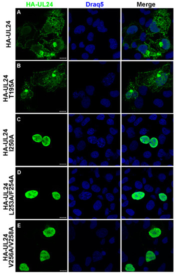 The localization of the various substituted forms of UL24 was analyzed via indirect immunofluorescence and confocal microscopy (Figure 4). Our results showed that when T195 was replaced with alanine, HA-UL24 was detected in both the nucleus and the cytoplasm, in a manner similar to that seen for the wild-type protein (Figure 4A,B), suggesting that the phosphorylation site T195 does not play a role in the cytoplasmic localization of UL24. In contrast, staining for HA-UL24 variants with the substitutions I250A or L253A/V254A was detected exclusively in the nucleus (Figure 4C,D). Similarly, the form V256A/V258A led to the accumulation of HA-UL24 predominantly in the nucleus with only weak detection in the cytoplasm (Figure 4E). These results demonstrate that these hydrophobic residues are part of a functional NES capable of directing the export of UL24 from the nucleus to the cytoplasm.