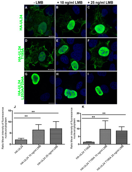 To determine whether the nuclear export dependent on the UL24 NES is mediated by CRM-1, we used leptomycin B (LMB), a specific inhibitor of this nuclear export pathway. COS-7 cells were transfected with a plasmid encoding wild-type HA-UL24 or with plasmids encoding the altered forms of HA-UL24. Twenty-two hours later, cells were treated with 10 ng/mL or 25 ng/mL LMB for five hours. We found that the lower concentration of LMB was sufficient to cause the nuclear accumulation of both wild-type HA-UL24 and HA-UL24 T195A (Figure 5A–F). As expected, the treatment of the cells with LMB had no effect on the localization of HA-UL24 with the non-functional L253A/F254A NES, which remained localized in the nucleus under both conditions (Figure 5G–I). The results were quantified by calculating the nuclear–cytoplasmic (N/C) ratio of the mean intensity of fluorescence of HA-UL24 in the presence and absence of LMB. Following the treatment of cells expressing HA-UL24 and HA-UL24 T195A with LMB, the N/C ratio of the mean intensity of fluorescence was significantly higher than that for cells treated with the vehicle alone (Figure 5J–K). Therefore, these results indicate that ectopically expressed UL24 can shuttle between the nucleus and the cytoplasm in a CRM-1-dependent manner.