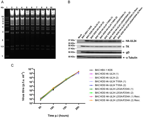 Characterization of recombinant HSV-1 BACs: (A) The EcoRV restriction pattern of genomes of the recombinant BAC HSV-1 strains carrying mutations in UL24. DNA was resolved on a 0.7% agarose gel and stained with ethidium bromide. The numbers (1) and (2) in the names of the viruses represent the different isolates. Lane 1, 1kb DNA ladder; lane 2, BAC HSV-1 KOS; lane 3, BAC_KOS HA-UL24 (1); lane 4, BAC_KOS HA-UL24 (2); lane 5, BAC_KOS HA-UL24 T195A (1); lane 6, BAC_KOS HA-UL24 T195A (2); lane 7, BAC_KOS HA-UL24 L253A/F254A (1); lane 8, BAC_KOS HA-UL24 L253A/F254A (2); lane 9, BAC_KOS HA-UL24 L253A/F254A (1) Resc.; lane 10, BAC_KOS HA-UL24 L253A/F254A (2) Resc. The sizes of the molecular markers are shown on the left. (B) Western blot analysis showing the expression of HA-UL24, HSV-1 TK, and HSV-1 gD by the different recombinant viruses. Lysates of Vero cells mock-infected or infected at an MOI of 10 with the indicated recombinant virus were analyzed via Western blotting with specific antibodies against HA, TK, and gD. The blot was also probed with an antibody against α Tubulin, which served as a loading control. The sizes of molecular weight markers are indicated to the left of the panels. Arrows to the right of the panels indicate the positions of the different proteins. (C) Replication curves for the recombinant viruses. Each virus indicated was used to infect Vero cells in duplicate at an MOI of 5. The supernatant and the cell-associated virus were collected at the indicated time points, and the total infectious virus produced was titrated. Error bars represent the standard error of the mean of two independent experiments.